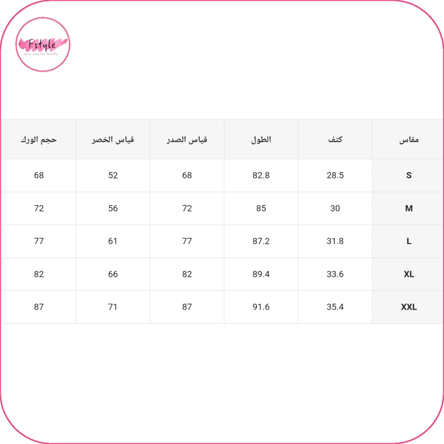 ننصحك عزيزتي بإتباع جدول المقاسات المرفق بالأسفل لضمان اختيار المقاس الصحيح